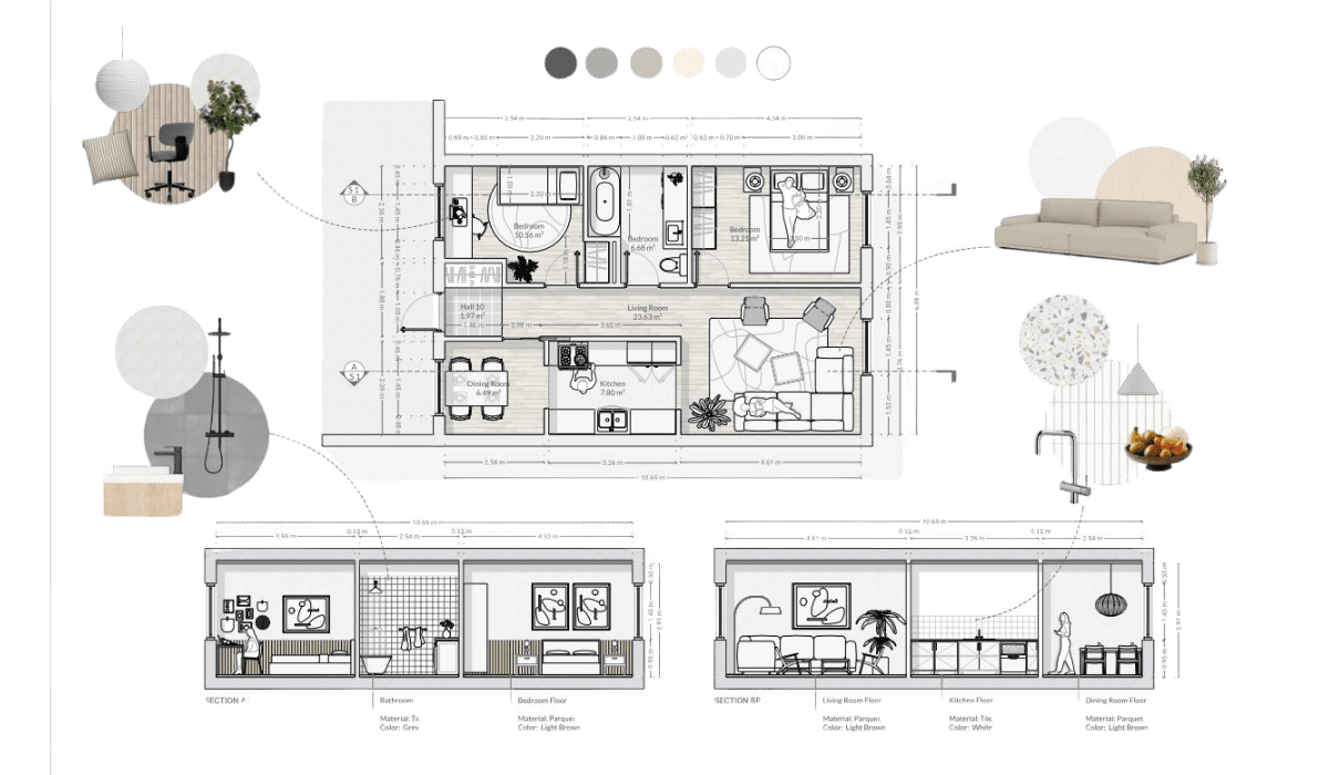 This process ensures the materials chosen are not only visually appealing but also meet the functional, durability, and environmental needs of the space.